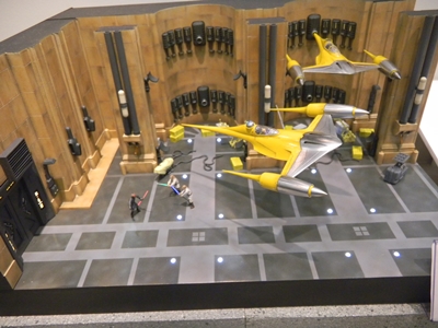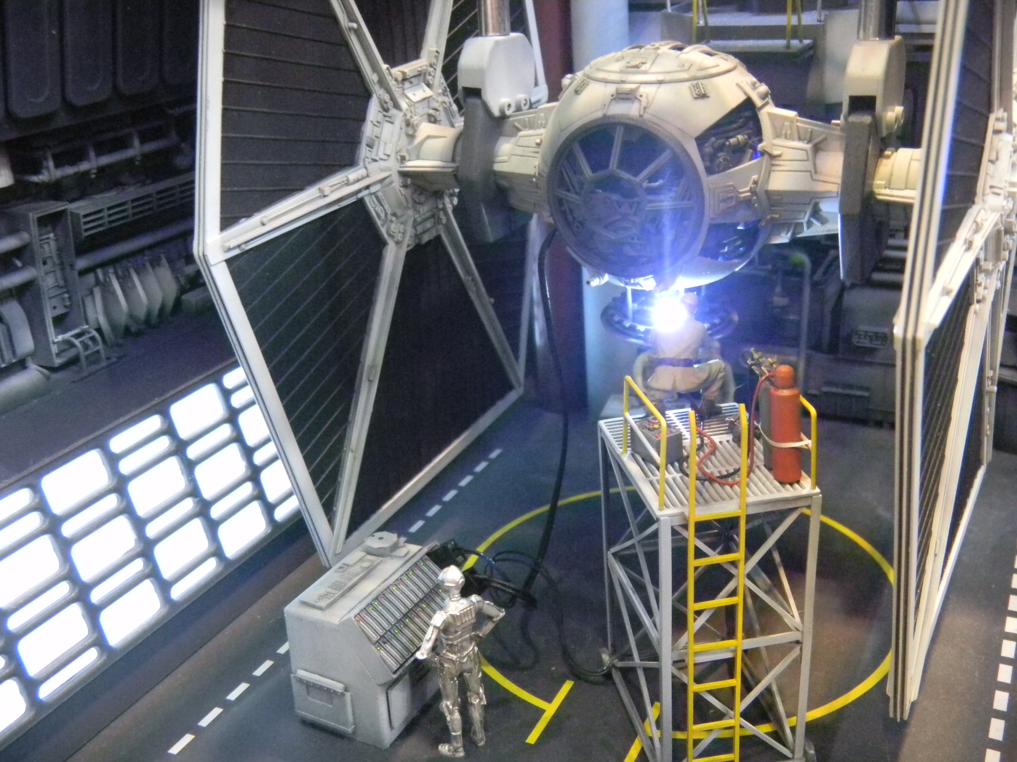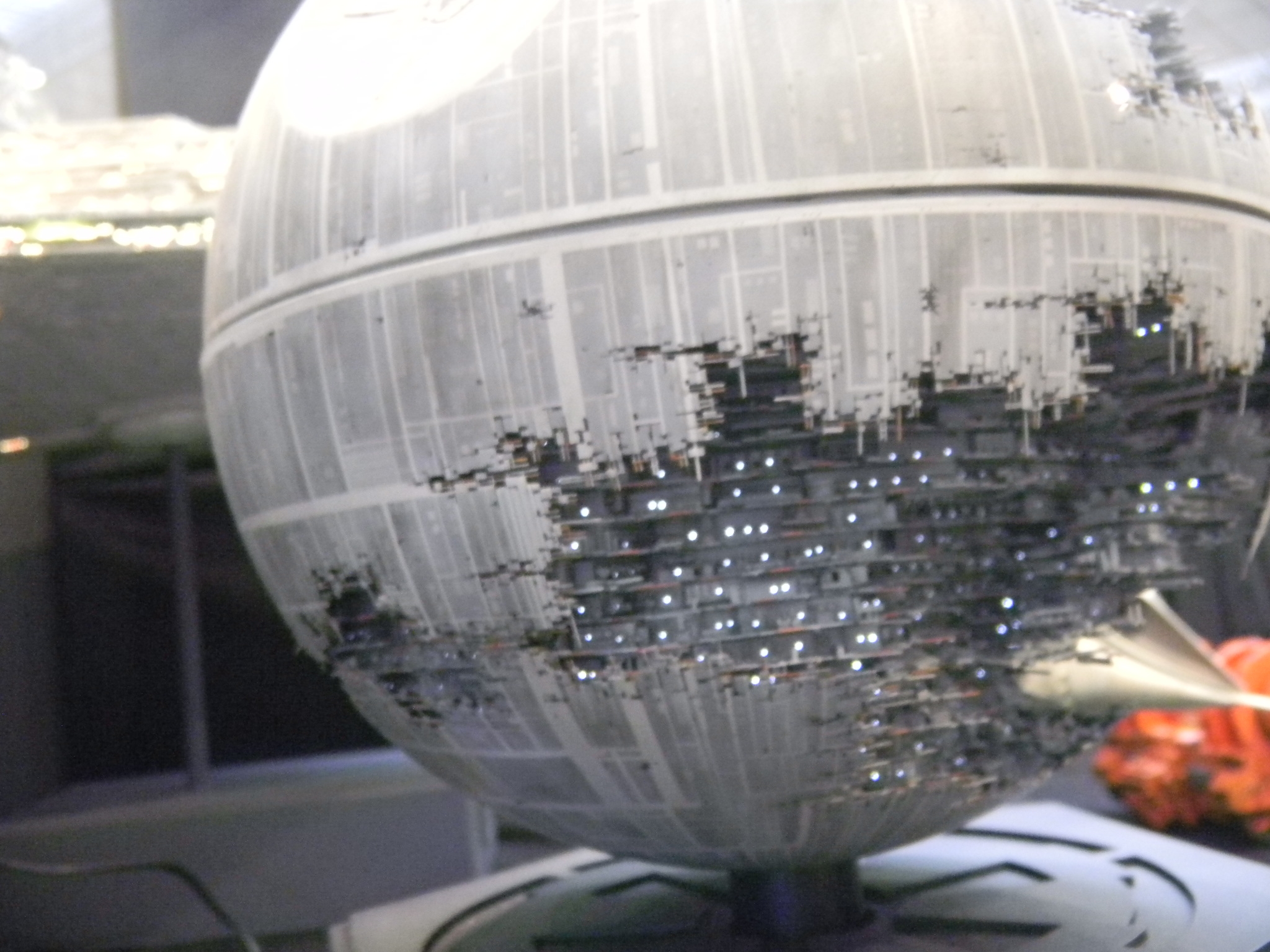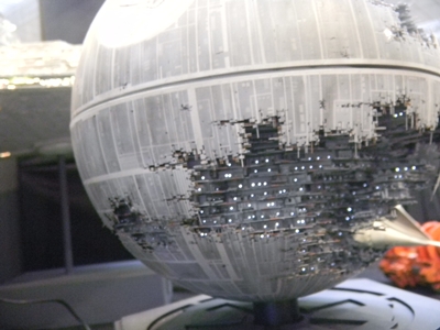 Left: A flickering light gave the image of a welder working on this TIE Fighter in the hangar. Can TIE Fighters really land on those solar panels, though? They're shown in the movies to be stored on racks. The Star Wars books and comics show them landing on the panels though, and it seems impractical as to how the pilots can get down from such a height. Right: The minute detail on this Death Star under construction was amazing, especially with the lights. I took several pictures of this, but most turned out out of focus, unfortunately.