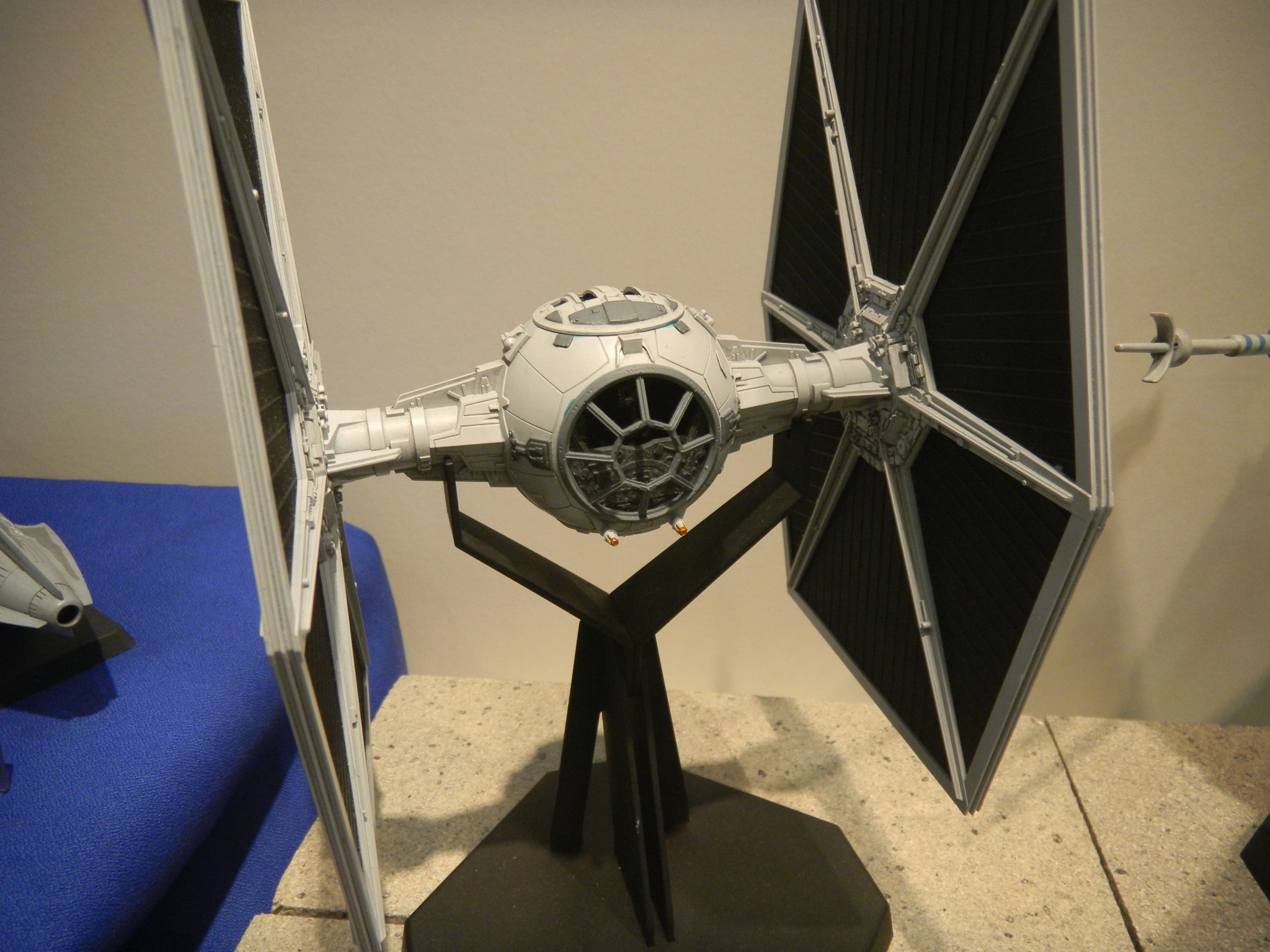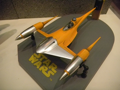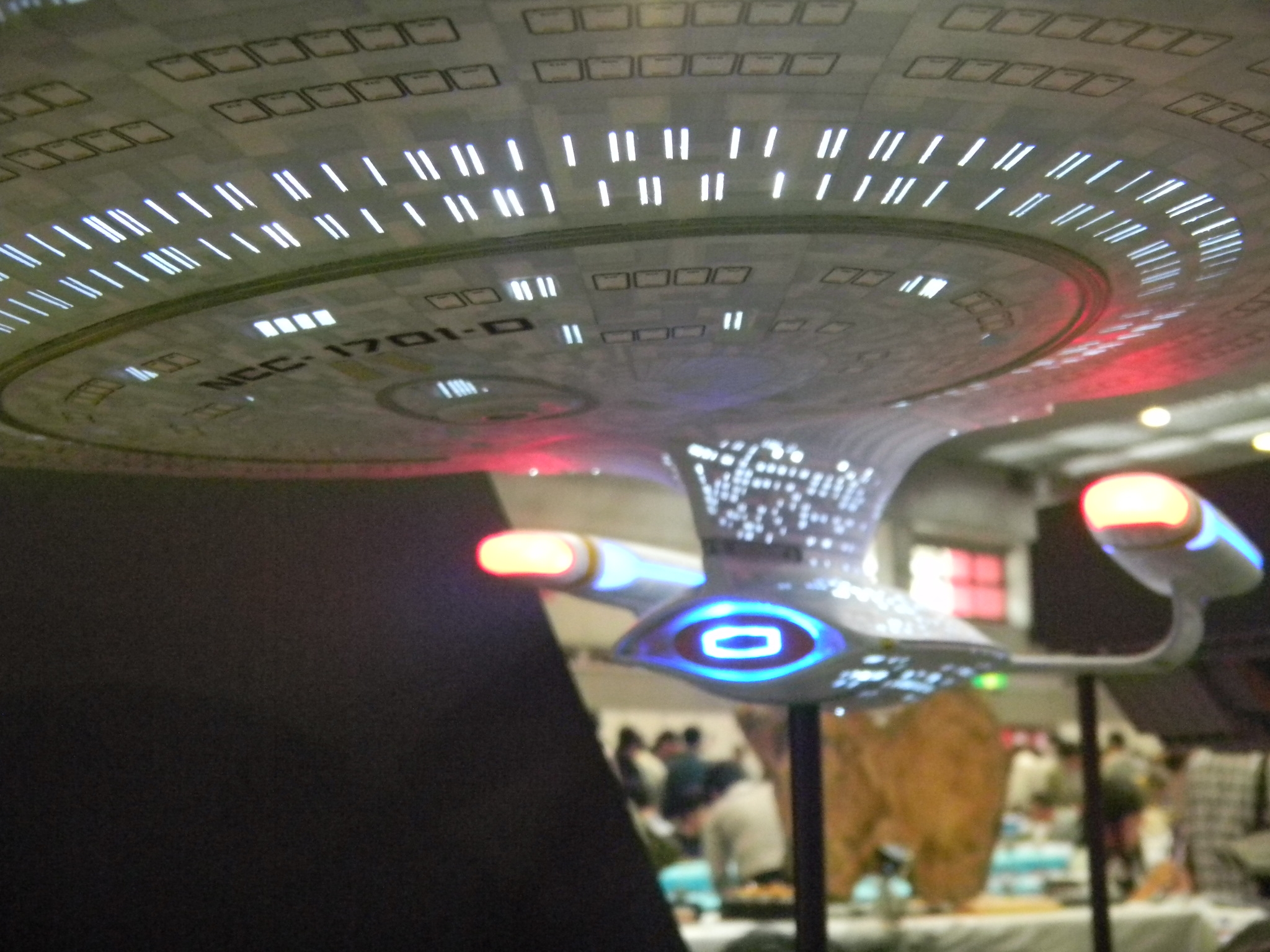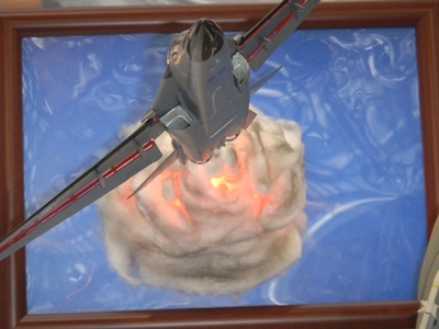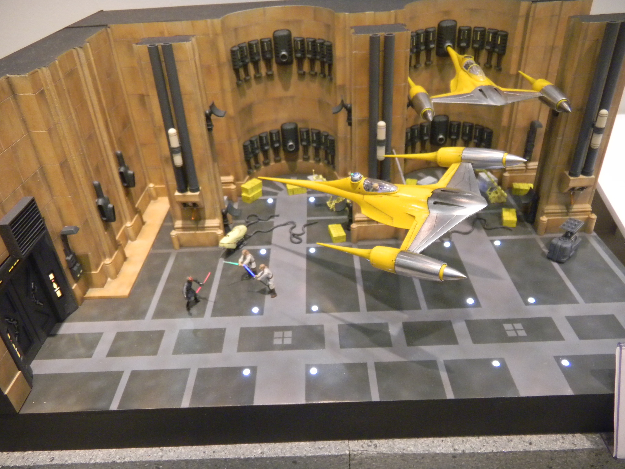 Left: A flickering light gave the image of a welder working on this TIE Fighter in the hangar. Can TIE Fighters really land on those solar panels, though? They're shown in the movies to be stored on racks. The Star Wars books and comics show them landing on the panels though, and it seems impractical as to how the pilots can get down from such a height. Right: The minute detail on this Death Star under construction was amazing, especially with the lights. I took several pictures of this, but most turned out out of focus, unfortunately.