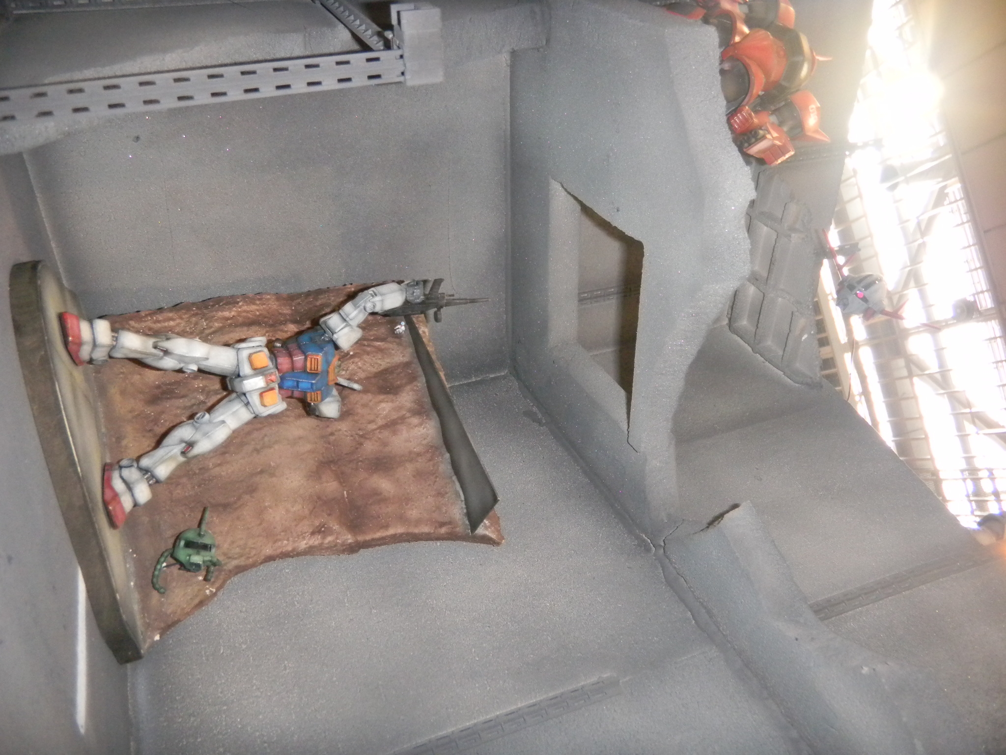 Left: The built a White Base big enough to fit HG Gundam models inside! Right: Someone knocked over the GMs!