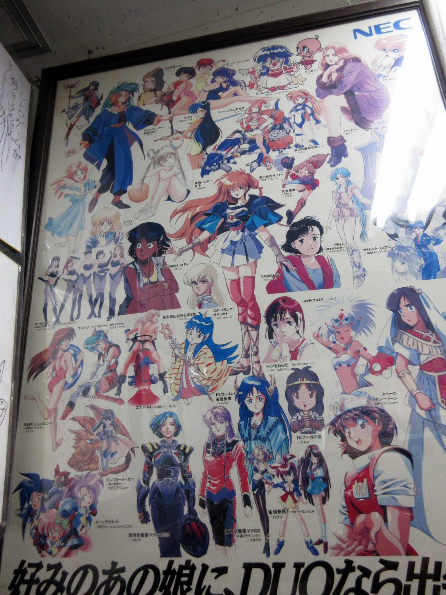 On the left is an NEC Turbo Duo ad poster. This is an amazing collage of anime/gaming heroines appearing on the Duo: Valis, Yamato, Galaxy Fraulein Yuna, Ranma 1/2, Fray, Devil Hunter Yohko, Nadia, Yawara, Cobra, Macross, Ys, Cosmic Fantasy, and more!