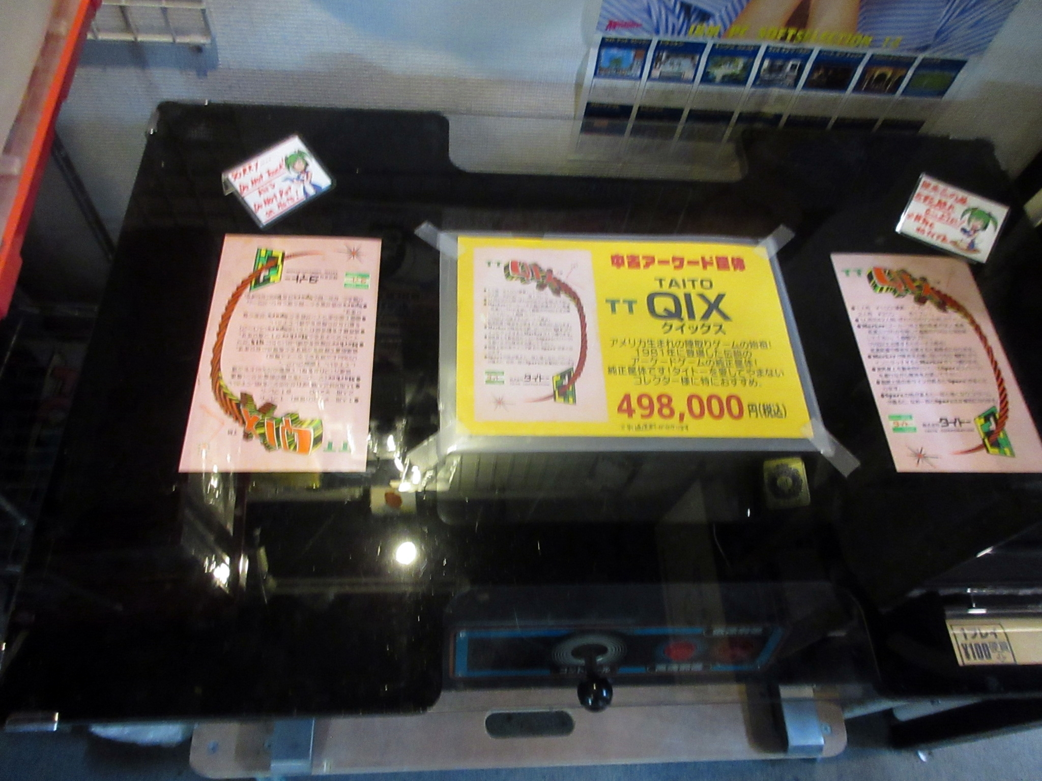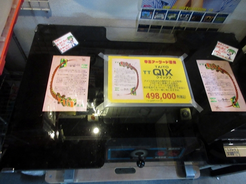 Left: some neat Capcom stuff with a poster for Final Fight and a leather jacket. Right: a Qix cocktail cabinet for sale!