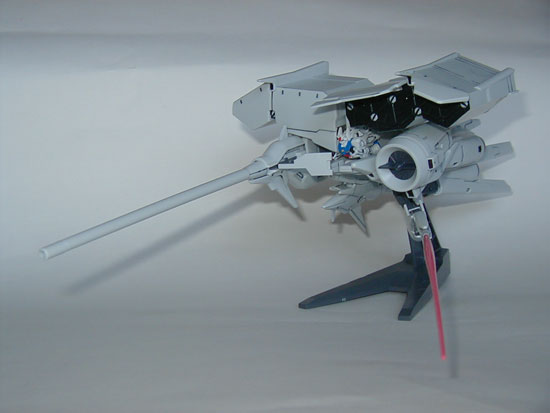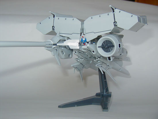 Not much painting was really necessary. I used the flat black enamel plus Zippo fluid trick to get the panel lines, and I used Testors Model Master Engine Gray to paint in the I-Field generator middle section. I also used Model Master Gun Metal to color the inside of the missile clusters. For the miniature GP03 Gundam unit, I used Gundam markers. I pressed them into a well to make the colors bleed out and I used a super fine tipped brush to get the details. Basic blue, red, black and yellow Gundam Markers were used. I was initially nervous about getting the minute details done, but I actually had fun painting the tiny little Gundam figure. Glue was definitely necessary for the Gundam.