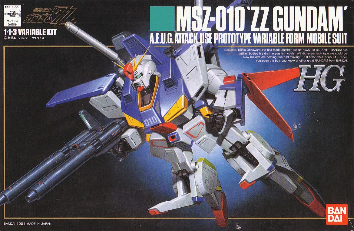 I started this model a year ago in January of '07. I never finished it because the crappy Testors airbrush of mine had broken, and I wanted to do the huge booster pack of the ZZ Gundam a bluish-gray color instead of the default color. I had assembled this kit a year ago, hand-painted where necessary, and applied the panel lines with the flat black enamel plus Zippo trick. This HG model also features the "System Injection" style, which means that little paint is required because the colored plastics are fused together. For the most part, I did not use the stickers it came with because these cheap-looking stickers are annoying and I was able to achieve a much better look with hand-brushing enamels instead. I only used the black dotted stickers for the legs and I chose not to apply the big "010" sticker on the chest, especially since I never saw this number on the mecha in the anime.