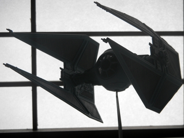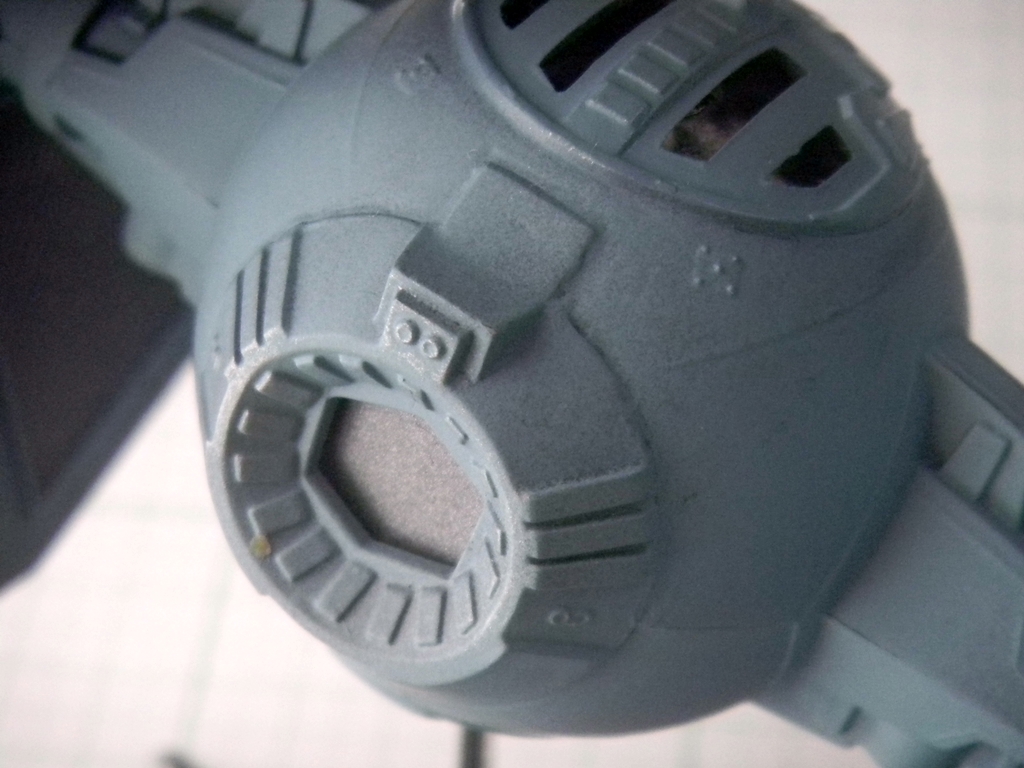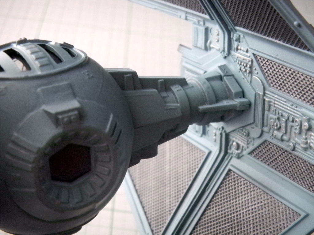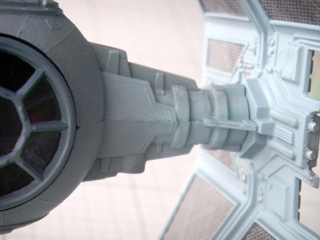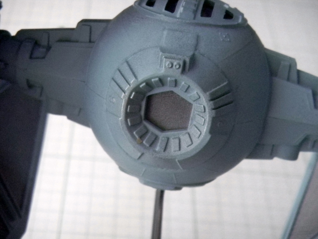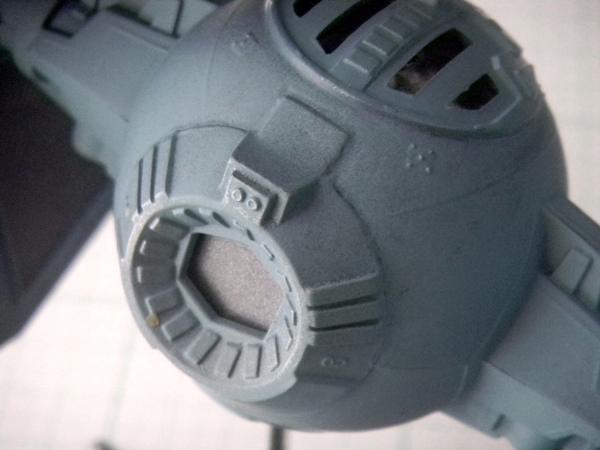 Well, speaking of accuracy, this TIE Interceptor model is fairly accurate, despite some flaws. The top hatch is actually not movable, and instead MPC thought that the back of the cockpit "ball" was where a hatch should be. I read somebody's post that originally, this may have been the idea behind the TIE Fighters, however with the Kenner TIE Fighter toy's hatch being on top, that changed the way that the hatch was conceived. Well, either way, this TIE Interceptor model has a hinged back door that looks pretty lousy if left alone. I glued and puttied it into place. I think I did a fairly good job at sanding the puttied area to make it look better.