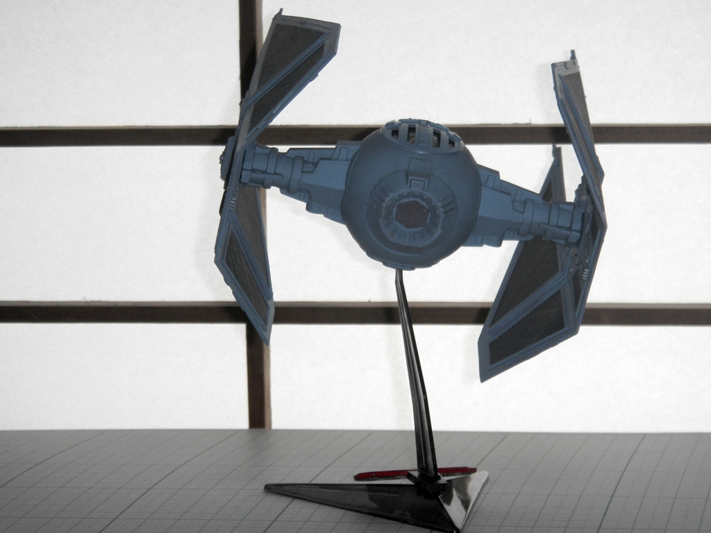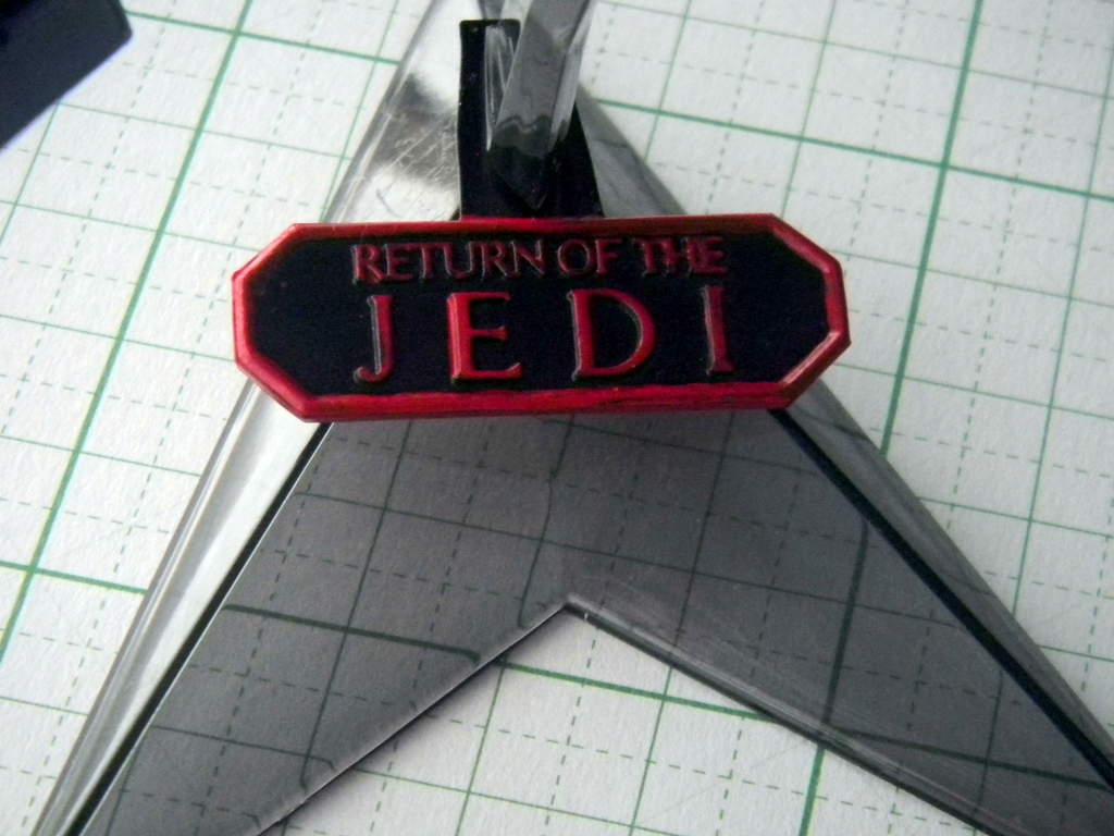 So after airbrushing, I noticed that there were a few areas where the application wasn't perfect, and the Gun Metal showed through slightly. I decided that to leave this alone, since it added a bit of flavor. At the same time, I didn't want to weather the model like I was weathering the Galaga starfighter model I was simultaneously working on. Traditionally, Imperial craft are not beat up and weathered like the "Rebel scum" craft are, since the Empire has the funding, personnel, and resources to upkeep their machinery more than the Rebel Alliance does. So I only did a very light application of drybrushing Testors Steel enamel in some places, and I applied some black artist's chalk very sparingly. Lastly, I spray painted the stand's "Return of the Jedi" plaque with Tamiya TS-40 Metallic Black and painted the lettering and border with Testors Red gloss enamel.