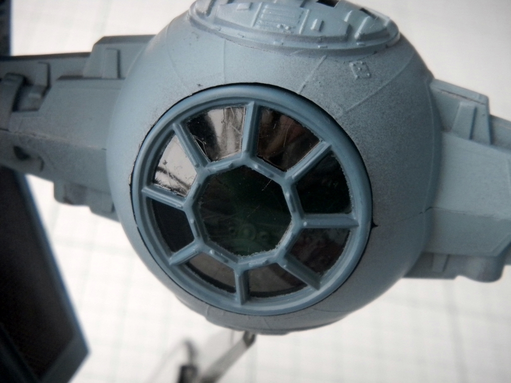 The dilemma I had was that the top hatch is molded together with the cockpit. The Fine Molds TIE kits have this hatch as a separate clear part, which you can mask off and paint. Piece of cake. However on this MPC kit, the "glass" part is separate and is attached to the underside. I knew that the two main halves of the body needed to have the seams worked on, sanded and puttied. But I couldn't just paint the model it all at once, because I would need to remove the top "glass" clear part before painting the hatch, and then replace it once the masking tape was removed. But I couldn't do this after the seams were filled! After all, this clear part doesn't sit flush with the hatch, so masking it while in place would have been difficult. I wanted to protect the clear top as well as the black interior of the cockpit. So, I masked the hatch from underneath and sprayed the top half with the Gun Metal. I knew that if I didn't, the hull color would be a bit lighter than that of the wings. Or, solar panels, I mean.