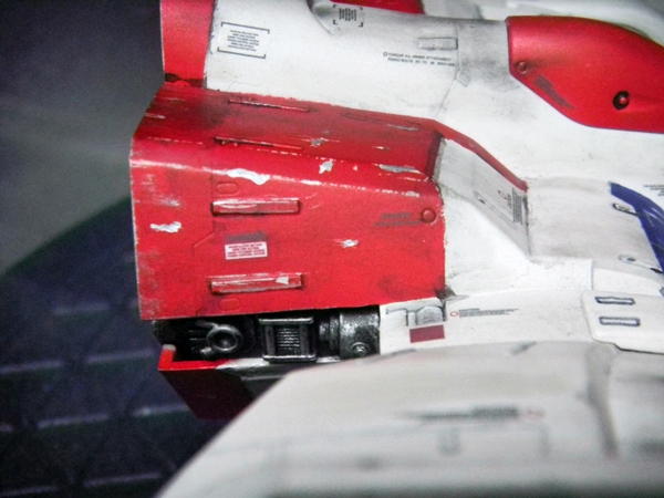 Panel lines were done by gray-colored Tamiya Panel Line Accent Color. I used the black version for the red and blue-colored areas. I used Testors silver enamel to drybrush the engines and create paint chips. The one cool thing about this model is the sheer amount of decals! Different retro video game-looking insignias can be chosen (VERY nice touch!) and I really like how the decals include those "kill marks" designating how many enemy bugs have been shot down. The paint scheme I chose was different than what the box suggested, with its splotchy gray-colored top coloring. I chose a paint scheme to make it closer to the game sprite. I envisioned this great space war with the Galaga aliens, with the "UGSF" ("United Galactic Space Force," I presume?) constantly outnumbered by these fierce swarms of attacking alien bugs. I pictured this fighter as only having its engines and weapons maintained, while it just looks dirty and beat-up. I have blast points as well as claw scratches on the hull.