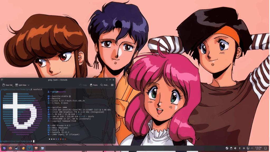 Here’s what my new Bazzite desktop looks like, with the girls from Bubblegum Crisis. My friend Lou is visiting Japan and gave me a Dell Optiplex mini computer (Intel Core i5) he rescued from the trash at his work after his company was bought out by a smaller competitor of all things. It had Windows 11 installed on it, and I installed Bazzite Linux which wiped away all that yuckie grodie Windows 11 crap off of it.