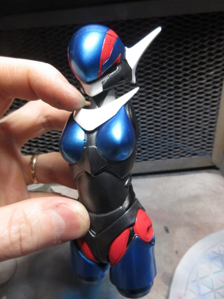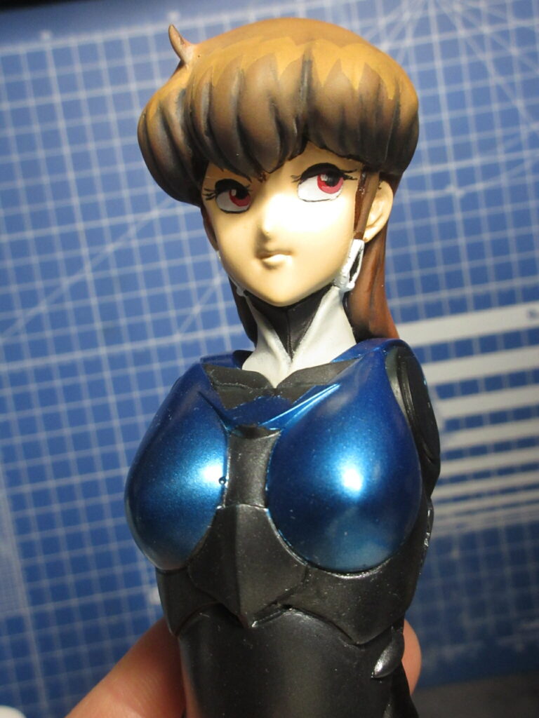 I’ve painted her entirely with sofubi paints. mostly V-Color but also I’ve used the new, water-based Mr. Hobby Sofubi Color for the metallic black parts. The metallic blue color of her hardsuit is a mixture of silver, clear blue, and a bit of regular blue V-Color paints. It looks so beautiful.