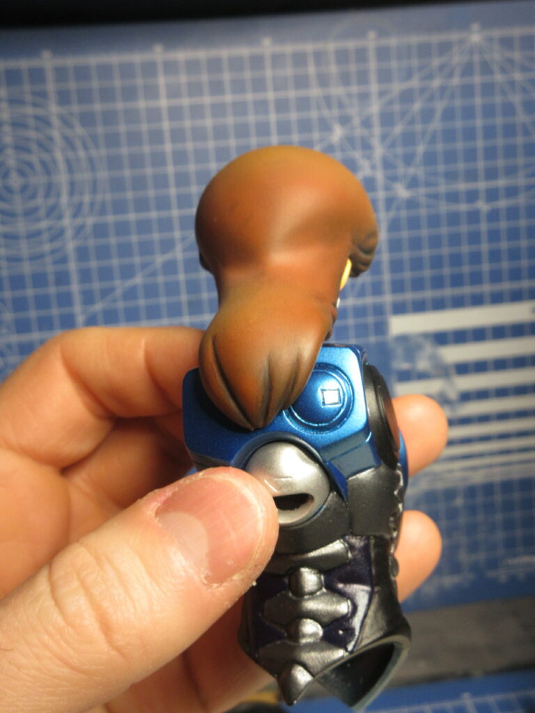 Unlike other sofubi kits I’ve made, this one is made to be semi-poseable. Her arms pop into sockets and her legs can swivel at the thighs. Her heads can pop in and out, and I’ve employed magnets to make this easier. Her regular face is sculpted with her neck together, but her helmet has the head and neck as separate pieces. I have magnets in there to make her head movable.