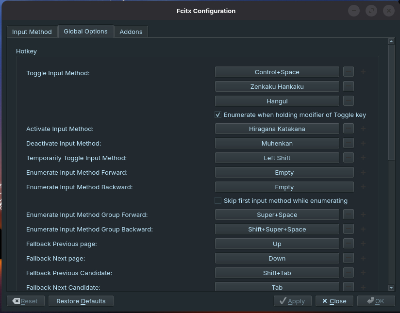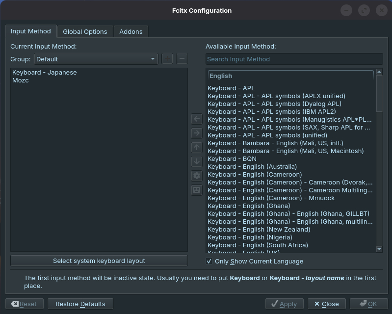 For input method, you will need to have “Keyboard” (here mine is a Japanese keyboard) as well as Mozc. Toggling between these two is what you need to do next. Click on the “Global Options” tab.