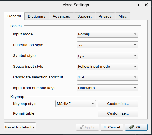 Make sure that the input method is set to Romaji. This means that you will press the S key and then the A key to give you さ and so on. Otherwise, it’ll think you have a Japanese style keyboard and I don’t think even Japanese people know how to use a Japanese keyboard. Keymap style should be set to “MS-IME.” So you really don’t have to change anything here. However, through the Mozc Settings you can add certain words to dictionaries and save them. This is useful for more obscure kanji readings for proper names and such.