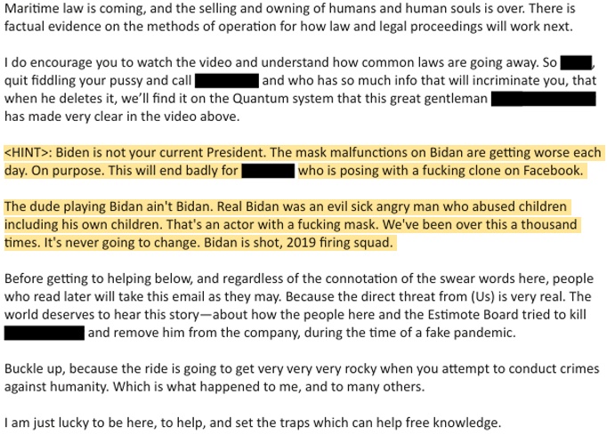 Whoever this is, he’s speaking with great confidence. We don’t know who wrote this or how much of it is valid. Note there is Biden and a misspelled “Bidan.” Maybe “Bidan” is a name given to the counterfeit one? Weird stuff, to say the least. The last part of the email, though, sounds just like Q: “Justice is coming. Because I’m burning the whole fucking thing down.”