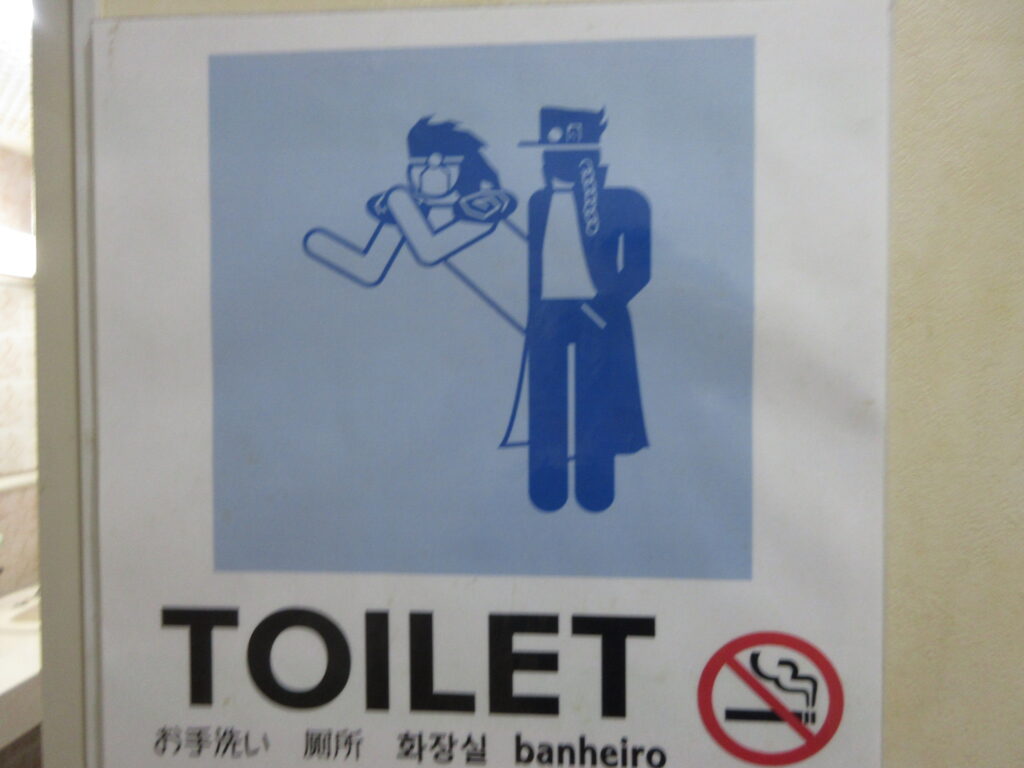Here are the signs for the restrooms: Jojo for male and Hatsune Miku for female.
