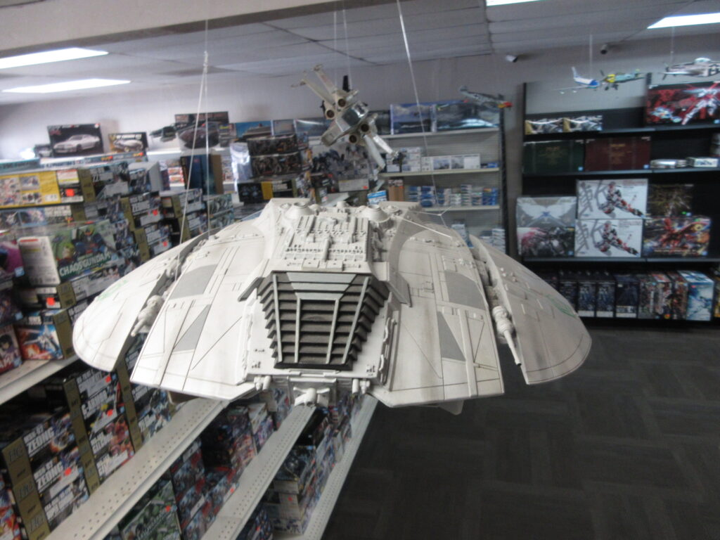 There was this awesome Cylon Raider by Moebius Models hanging from the ceiling. I reached up high to take this photo. There was also an old Kenner X-Wing toy behind it. Notice all the Gunpla on the shelves in the background below.