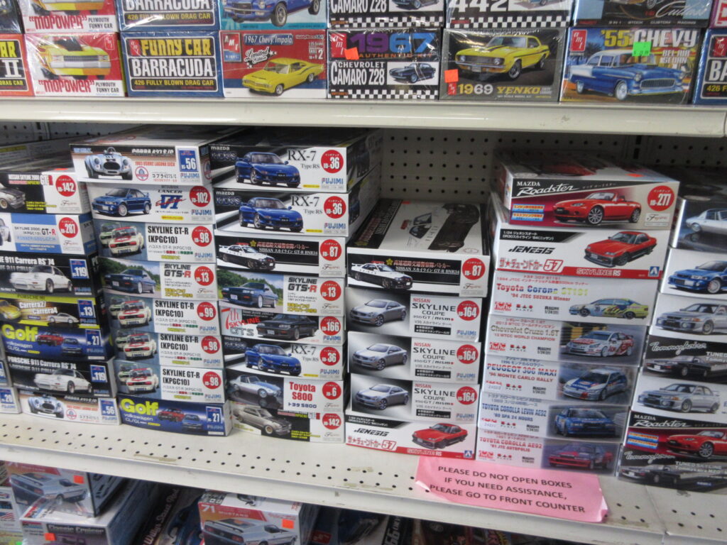So many Fujimi car model kits! Years ago when I worked at Aoshima, I had tried to build a relationship with Andy and tried to get him to purchase Aoshima kits directly from me. It didn’t really work out though. I don’t know why. Still, it was great to see all of the Fujimi car kits there.