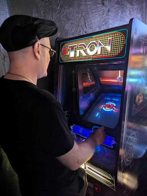 Here I am, playing Tron. It’s one of my favorite movies, but I admit that the game is only so-so. As a kid, I really enjoyed the successor, Discs of Tron, far more. That said, this game cabinet is an exquisite work of art, with all the glowing detail which matches the movie, and the blacklights that create that fantastic glow. These two aspects really capture the ambience to the movie so well.