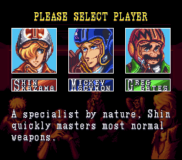 When you begin the game, you get to choose between three pilots from the series: Shin Kazama, Mickey Scymon, and Greg Gates. All three have different specialities. Shin raises his firepower level the quickest, Greg recovers from battle damage the quickest, and Mickey does more damage with his special weapons than the other two. Plus, when you pick up a bonus weapons rack, he will get about two or three times the amount of extra special weapons. Even if you've used them all up, he will get the max double amount. If you are a beginning player, I suggest playing as Greg. When you get better at dodging incoming fire, promote yourself to Shin.