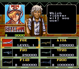 There are six different fighters that are available for you. The F8E Crusader is what you start out with. It is a basic air and ground attack jet, and can handle only a few weapons. This is what Shin starts out with in the beginning of the series until he is shot down. (Maximum fire power = 5, speed class = C.) The F20 Tiger Shark is what Shin buys to replace his old F8E with. The F20 is an upgraded version of the F8E and can handle more of a variety of air and ground weapons. (Max POW=5, Speed=B.) The F14D Tomcat is Mickey's plane of choice. It's the fastest jet available, but it is basically an air-to-air dogfighter, and not very useful against ground targets. (Max POW=5, Speed=A.) The A10A Thunderbolt is Greg's ground attack jet. It fires in two directions: in front and diagonally below. This is very useful in that you don't need to get down close to the ground in order to attack targets, since enemy aircraft can pin you down this way. It handles all air-to-ground weapons. (Max POW=3+3, Speed=D.) The YF23 Stealth Ray is undetectable to homing missles. (Funny, I don't remember any stealth fighters in the early 80's.) (Max POW=6, Speed=B.) The F200 Efreet is the best fighter available, the latest in Soviet technology. It can handle all weapon systems. (Max POW=7, Speed=B.) In order to win the game, I find that the best strategy is to buy the Tiger Shark, the Thunderbolt, and then the Efreet. Don't waste your time with the Tomcat or the Stealth Ray.