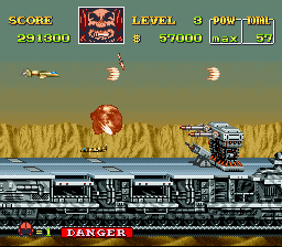 Area 88 is a side scrolling shmup in which you are flying modern day aircraft as a mercenary pilot. Since you are a mercenary, you are responsible for buying your own ammunition and aircraft. Each target you eliminate, you earn commission. Along the way, you pick up powerups, which are either left behind by defeated enemies or are in secret locations you shoot to reveal. The yellow lanterns increase your firepower by 1x, while the blue lanterns increase your firepower by 3x. Your firepower is increased by ranks, so you must first build up your POW meter. Magazines replenish your special weapons stocks, unicorns provide an electrical shield, fuel tanks refill your fuel/life meter, stars give you a $50,000 bonus, and the mecha icon is a smart bomb that will destroy all enemy vehicles when it is collected.