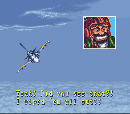 This game has some of the best graphics I've seen on the SNES, especially considering that this game was released so early in the console's lifetime. Each time your plane is hit by enemy fire, an alarm goes off and flashes inside your cockpit, and your character winces as the plane shudders. What is cool about this game is that it encourages you to keep playing the game, even after you have beat it on an easier level. You are awarded an additional animated sequence at the end of the game on the Normal level that you don't get on the Easy level. I have beaten the game on the Hard level setting, and I was a bit disappointed. There isn't much of an additional animated sequence at the end. The only thing new is a bunch of hopping bunnymen who spell out "THANKS." I don't know if the Gamer setting comes with its own animated ending sequence. I hope it does, but I don't know if I'll ever see it.