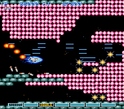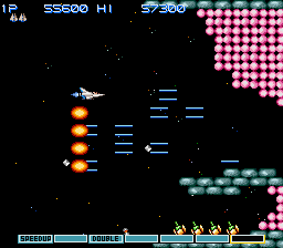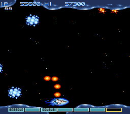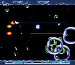 Who doesn't know Gradius? I almost feel embarassed to explain the gameplay. A side-scrolling shooter, powerups are collected after shooting yellow enemies or a chain of enemies. The powerups are on a point system, so you can save up these powerups to obtain speed ups, missles, more powerful firepower, options, and shields. Before you begin your game, you can choose your powerup configuration from some preset choices or customize your own. For example, you can choose between the laser, ripple, or double laser.