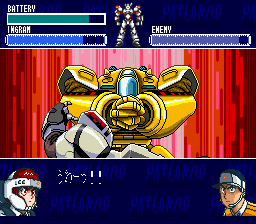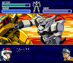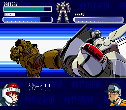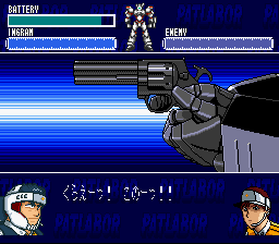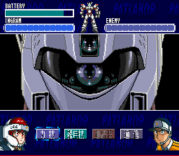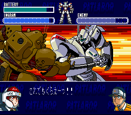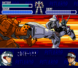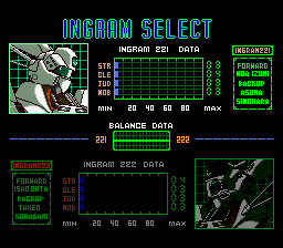 The top part of the screen shows your Ingram's battery charge, a pilot's helmet symbol (or "headgear mark" as the instructions call it), and something the instructions call an MVS gauge. You move your Ingram around the field as you would expect, and you can recharge your battery by visiting your carrier. When the MVS gauge fills up, you can select your actions when the headgear mark lights up. You will want to press the button quickly before your opponent has a chance to initiate an attack. When you attack, you get to choose from a menu of different attacks that grows as your experience increases, such as punch, kick, tackle, pistol, stun stick, trip wire, etc. When you defend yourself from attack, you get to choose between dodging and blocking the attack, and when you become more experienced, you can use your enemy's attack against them, as in Judo techniques. Between missions, it is a good idea to practice against another Ingram to give you more experience. This is where the level-grinding takes place in order to raise your EXP. And be sure to keep good stats for both pilots, as some missions are more suitable to one pilot than the other. And a hint: the final level will have you switching between both Noa and Ohta in different locations.