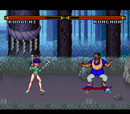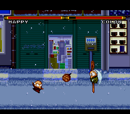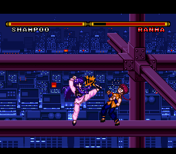The first Ranma game for the Super Famicom features some of the series most popular (and wacky) characters! Ranma Saotome hears about a martial arts tournament, with an invitation to see China (If you read the manga or seen the anime, you know where this is going) as the prize. Other Ranma characters are there either for the prize, or just to cause Ranma trouble. The 1 player story mode lets you pick Ranma only. However,you get to pick before each opponent if you wish to be Ranma boy or girl.Your first opponent is Genma (Genma Saotome), then Kodachi (Kodachi Kuno). After that, you enter a bonus round with Happy (Happosai), and have to hit him 10 times before time runs out to earn an extra credit (continue). Next,you fight Kunoh (Tatewaki Kuno), then Kohchoh (Principal Kuno). Next is a bonus round with Colon (Cologne), where you must hit the bowls of ramen and sweet chestnuts she throws (any combination of 10) before time runs out to earn one more credit. Then,you take on Shampoo (Shampoo) and then the final opponent, Ryohga (Ryoga Hibiki). Ranma finds out what the "invitation to see China" really is (I won't spoil it for you if you don't know...but it is in both the anime and manga...the "Ranma and Juliet" storyline), and a funny end credits chase ensues! The 2 player mode lets you duke it out as Ranma boy, Ranma girl, Genma, Kodachi, Kuno, Kocho, Shampoo and Ryoga. However....(See Extras for more!) The controls can be set to your preferance in the options menu,but you cannot set the "Jump" move to the directional pad.