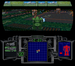 In this game, you control your Votoms mecha in a 360 degree arena and fight your enemies. This is as close as the Super Famicom can get to 3D graphics, as seen in games like Mario Kart and F-Zero. It uses the DSP chip found in such games.