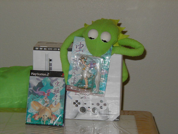 So to show off my new treasure, I enlisted the help of my friend Kermit the Frog to help model for my neat stuff and had Yuka-chan take the pictures. Pictured here is my new Ceramic White slimline PS2, the limited edition Mushihime-sama box with game and the figure of the princess Reko as a child, as well as the adult Reko figure. (And no, I'm not going to take pictures up her skirt.) You may also notice that in these pics, I'm wearing a matching Kermit shirt. Hi-Ho!