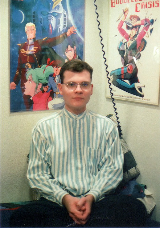 To the right I'm sitting on my bed. You can see my Dirty Pair, Gundam: Char's Counterattack, and Bubblegum Crisis posters behind me.