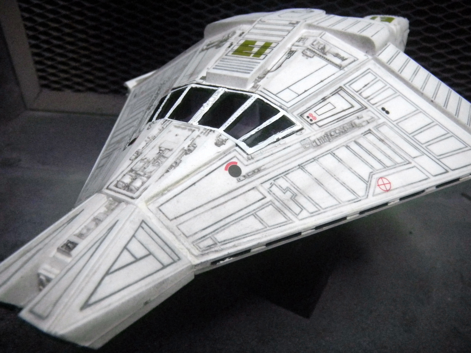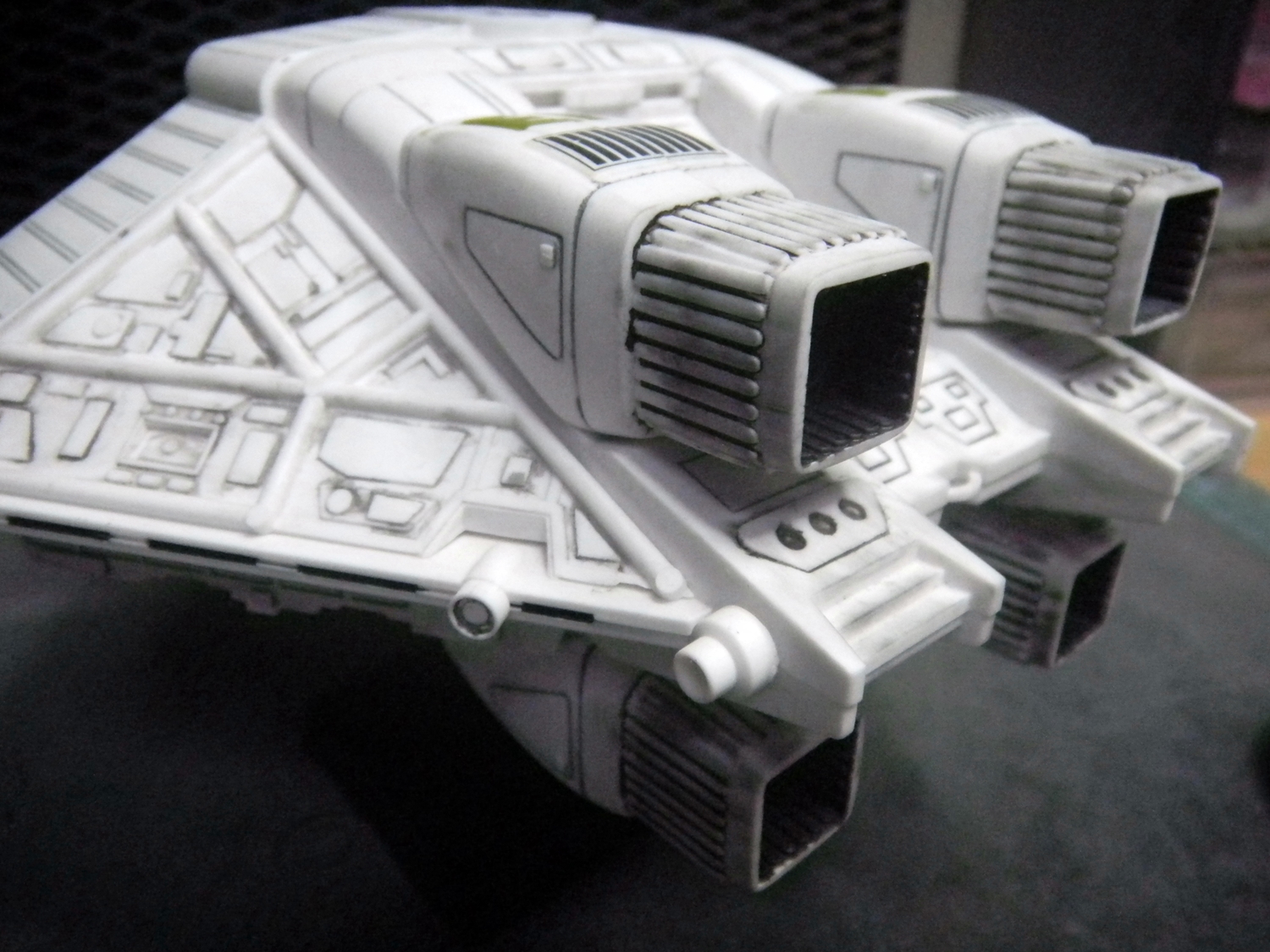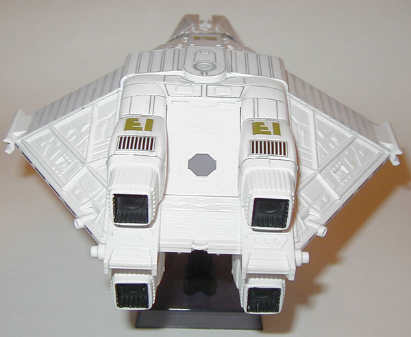 The Narcissus is my favorite ship from the Alien series. Yes, even more than the Sulaco. I just love this shuttle. But yes, the nose of this model is just as bad as the rumors say. But other than that, it really wasn't so bad to put together. I painted dark gray into all the cracks and wiped off the excess with a paper towel soaked in thinner, leaving only the paint in the cracks for detail. I really wish I knew about Gundam markers in November of 2005 when I built this model, because it would have made this a lot easier. I did not bother detailing anything inside the cockpit because the windows are so dark anyway that it wouldn't have made a difference. I wish I didn't bother putting on the red "EI" decals on the ship, because the Narcissus didn't have this in the movie anyway.