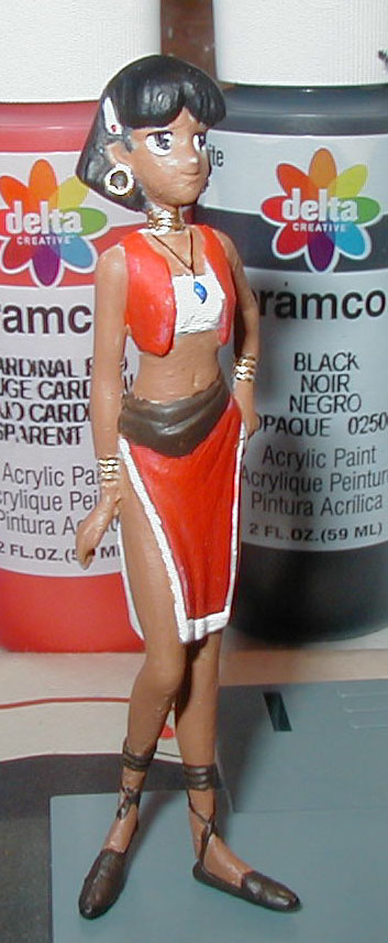 This is nothing compared to what I see others doing on the Hobby Fanatics forum, but I am impressed with what I was able to do for a first-time model. I think I did a fairly good job my first time around, considering that I've never painted an anime figure before (and a small one at that). The figure actually looks a lot better in-person. The zoom on the lens, in conjunction with the flash, accentuates where the paint was applied unevenly. Also, it turns out that the Spice Brown Delta paint is semi-opaque, so the flash reveals a bit of the primer underneath that is not visible when looking at it with the naked eye. From now on, I'll be far more careful with these Delta Ceramcoat paints to make sure I'm using opaque paints. But by far, these crafts-grade paints are pefect for painting small figurines, after they are diluted with some water.