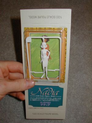 When I first bought this model, I was surprised to find that the model comes with a small figure of Nadia. It was small, and I was sure that it would be very difficult to paint. It's made of the same typical plastic the model kit is made of. I've never painted an anime figure before, so I consulted the members of the Hobby Fanatics forum as to how I should go about painting the Nadia figure it came with. I primed it with Tamiya surface primer and painted the figure with Delta Ceramcoat as someone on the forum suggested I use. Fortunately, the instructions explained how to get the skin tone: brown, white and orange. Her hair is black with a tint of blue. Her shoes and sash were brown and black mixed. The gold bracelets and earrings are Testors gold enamel paint. I learned that ceramic paints do not always mix well together. The Ceramcoat black did not like mixing with Mr. Hobby Gundam Blue, so I had to get Ceramcoat Ultra blue. (It wasn't until later that I found out that Gundam Color paints by Mr. Hobby are actually lacquer paints, not enamel.) The list of Delta Ceramcoat colors I used are White, Black, Cardinal Red, Ultra Blue, Bittersweet Orange, and Spice Brown. I finished it off with an overcoat of Future.