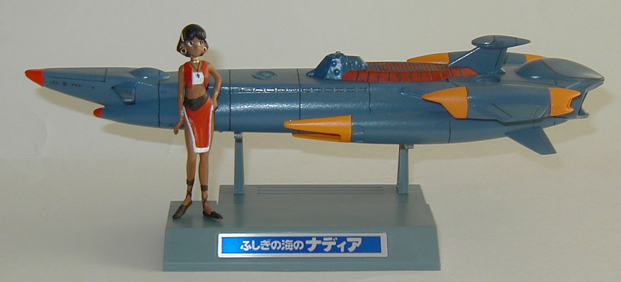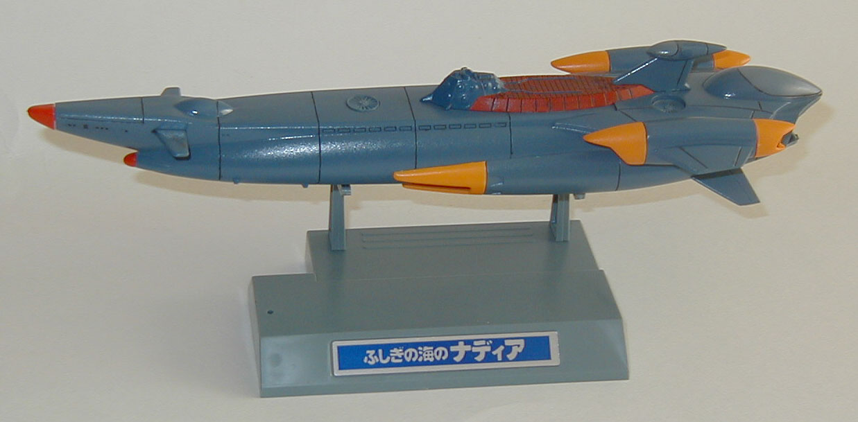 This is a very basic model of Captain Nemo's Nautilus from Fushigi No Umi No Nadia, with very few parts to assemble. Since I'm finally comfortable with using my new Paasche airbrush, this model is 95% airbrushed with Tamiya acrylic paints. The yellow parts are yellow paint with a touch of red to make it slightly orangish, the hull is blue with gray, the lighter parts have less blue, and the red top part is red with a bit of brown to darken it. The nose cones are actually hand-brushed red Testors enamel paint, the only hand-brushed part of the whole model.
