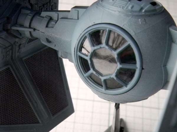 The dilemma I had was that the top hatch is molded together with the cockpit. The Fine Molds TIE kits have this hatch as a separate clear part, which you can mask off and paint. Piece of cake. However on this MPC kit, the "glass" part is separate and is attached to the underside. I knew that the two main halves of the body needed to have the seams worked on, sanded and puttied. But I couldn't just paint the model it all at once, because I would need to remove the top "glass" clear part before painting the hatch, and then replace it once the masking tape was removed. But I couldn't do this after the seams were filled! After all, this clear part doesn't sit flush with the hatch, so masking it while in place would have been difficult. I wanted to protect the clear top as well as the black interior of the cockpit. So, I masked the hatch from underneath and sprayed the top half with the Gun Metal. I knew that if I didn't, the hull color would be a bit lighter than that of the wings. Or, solar panels, I mean.
