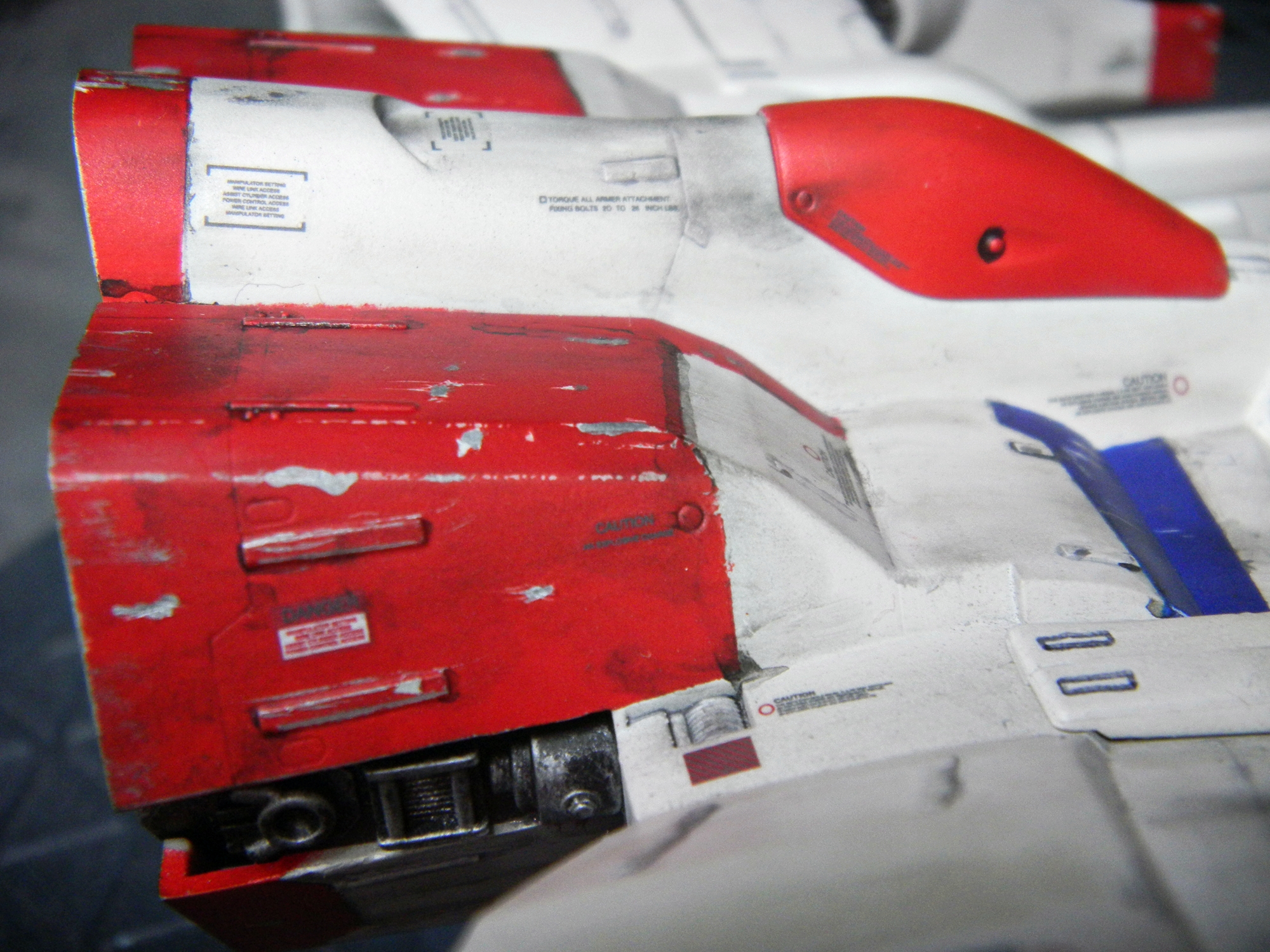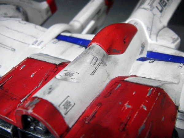 I used the Nouvel Carre pastel chalks to really dirty up this ship. I carved some blast points into the surface of the model before painting, I dotted those with Testors silver enamel before the matte clear coat, and then applied the chalk. The color of chalk I used for rust didn't really stand out when applied, until I got it wet. (I actually didn't use water because I didn't feel like getting up. I admit that I just used a bit of spit. :D ) You won't see that in the video though. I'd feel silly showing that in the video of the build.