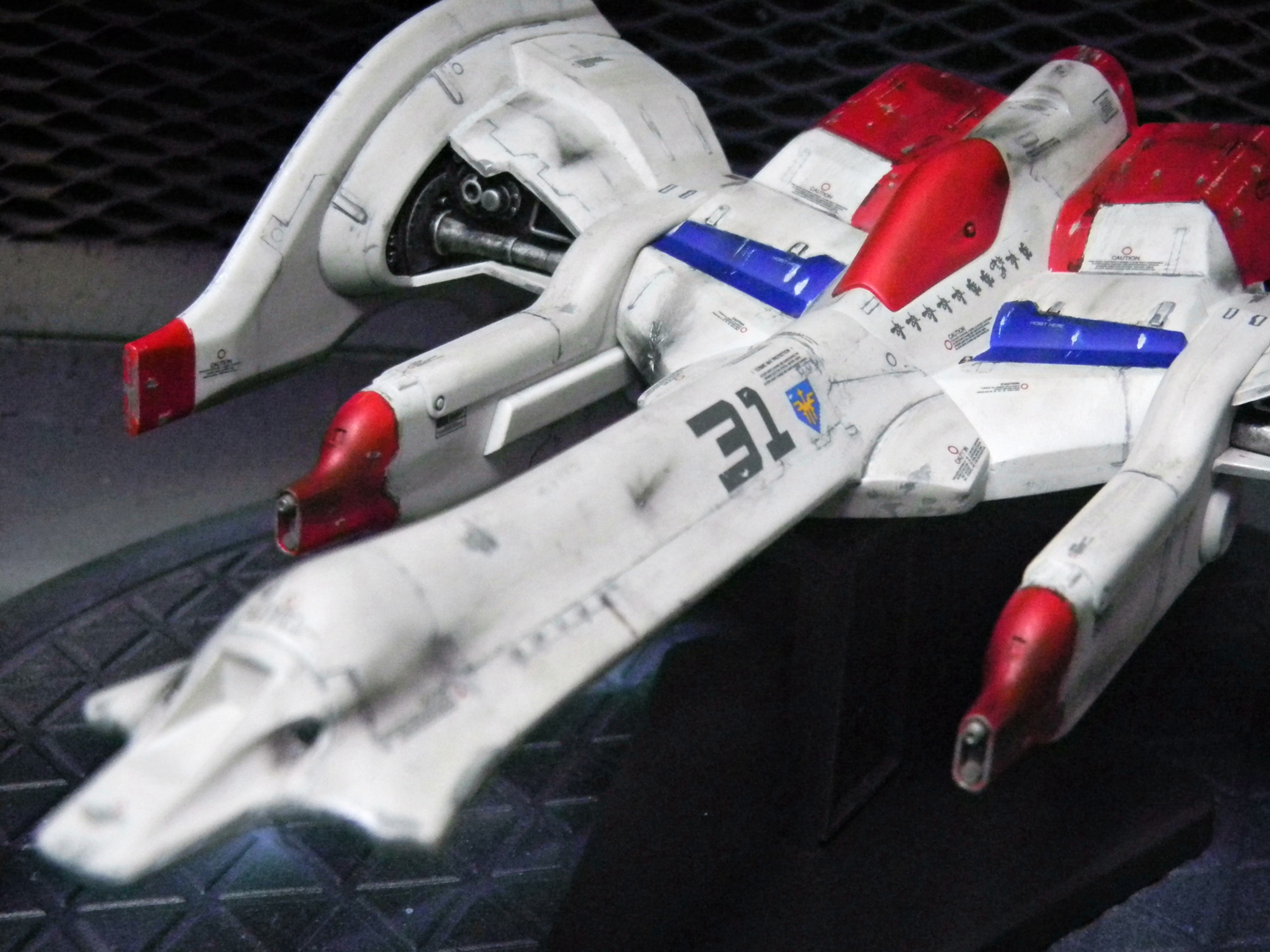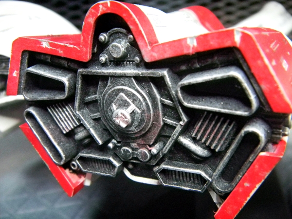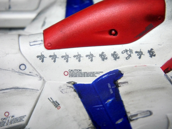 Panel lines were done by gray-colored Tamiya Panel Line Accent Color. I used the black version for the red and blue-colored areas. I used Testors silver enamel to drybrush the engines and create paint chips. The one cool thing about this model is the sheer amount of decals! Different retro video game-looking insignias can be chosen (VERY nice touch!) and I really like how the decals include those "kill marks" designating how many enemy bugs have been shot down. The paint scheme I chose was different than what the box suggested, with its splotchy gray-colored top coloring. I chose a paint scheme to make it closer to the game sprite. I envisioned this great space war with the Galaga aliens, with the "UGSF" ("United Galactic Space Force," I presume?) constantly outnumbered by these fierce swarms of attacking alien bugs. I pictured this fighter as only having its engines and weapons maintained, while it just looks dirty and beat-up. I have blast points as well as claw scratches on the hull.