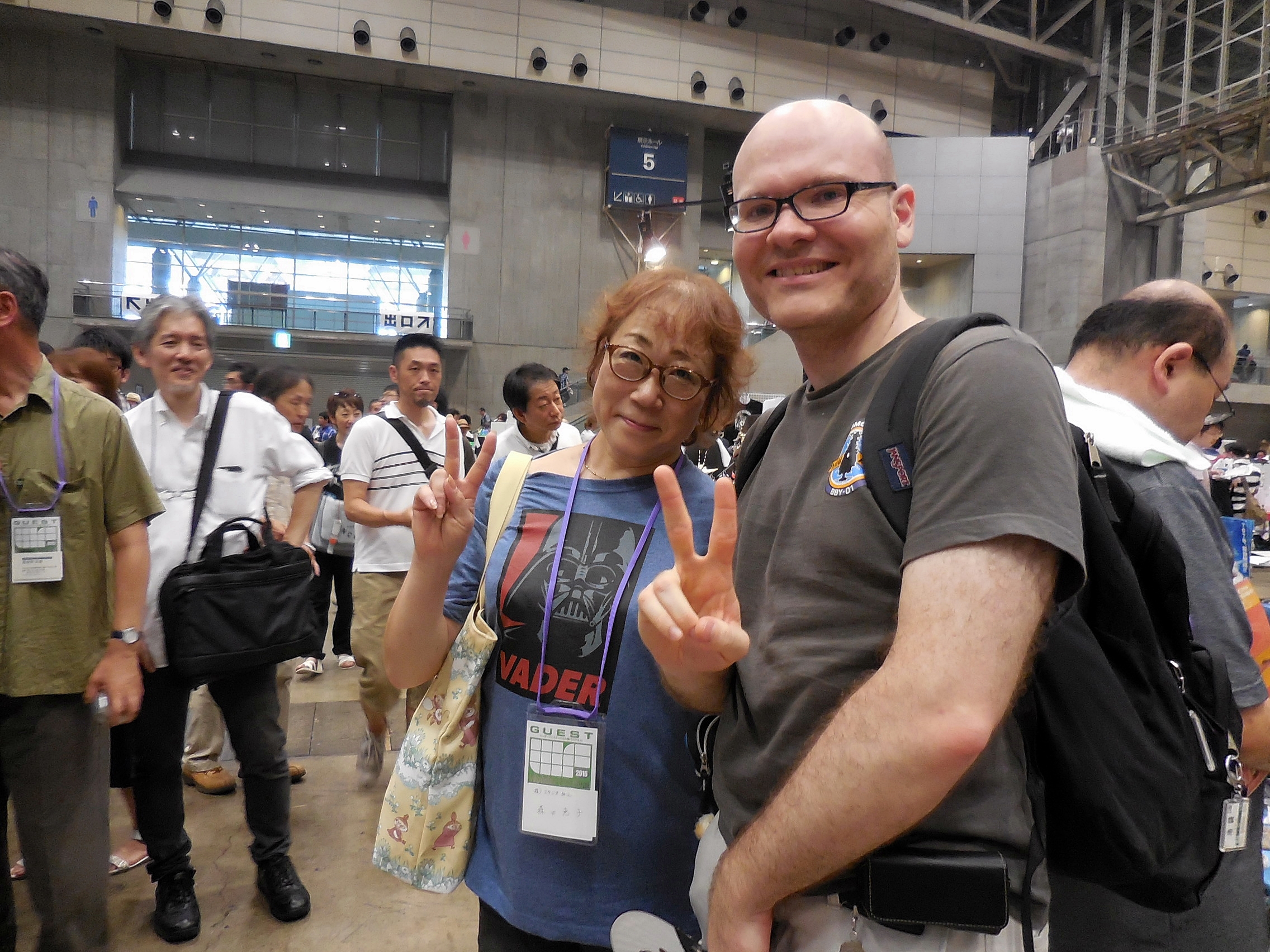 OK, so a couple of years ago, I made the acquaintance of one of the vendors who was selling a resin GK of Dirty Pair's starship, the Lovely Angel. There have been many different versions of this ship among the TV show, OVA, and movies. The one I bought from him was the red one. He was happy to meet a Dirty Pair fan from America. His name is Hiro. Last year I bought another version of the ship for someone in France who had seen my coverage of the 2013 Summer WonFes. So anyhow, I had contacted him again this year to see what he was selling. When I saw him at the event, he introduced me to some Studio Nue employees. Studio Nue is the anime studio behind Yamato, Captain Harlock, Crusher Joe, Macross, Orguss, Dirty Pair, and several other famous anime. The woman wearing a Darth Vader T-shirt who Hiro introduced me to was Keiko Katou from Studio Nue, who you see in the picture with myself. Hiro used a word I was unfamiliar with, so he described her as the "model" or the "heart" of Dirty Pair. I looked up Studio Nue's Japanese Wiki article and could not find her name. I'll have to get confirmation from Hiro about what exactly her role was. I also met her husband, who I assume is Naoyuki Katou, one of the founders of Studio Nue. He liked my Yamato 2199 T-shirt. Hiro told him of my connection with Aoshima, and Mr. Katou said, "Oh, then you must be familiar with 'Arpeggio of Blue Steel.'" I told him that I'm familiar with the name, but I haven't seen the anime. He asked me to watch it. I'll give it a try!