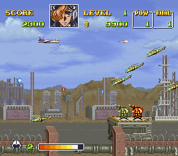 Area 88 is a side scrolling shmup in which you are flying modern day aircraft as a mercenary pilot. Since you are a mercenary, you are responsible for buying your own ammunition and aircraft. Each target you eliminate, you earn commission. Along the way, you pick up powerups, which are either left behind by defeated enemies or are in secret locations you shoot to reveal. The yellow lanterns increase your firepower by 1x, while the blue lanterns increase your firepower by 3x. Your firepower is increased by ranks, so you must first build up your POW meter. Magazines replenish your special weapons stocks, unicorns provide an electrical shield, fuel tanks refill your fuel/life meter, stars give you a $50,000 bonus, and the mecha icon is a smart bomb that will destroy all enemy vehicles when it is collected.