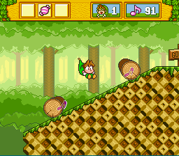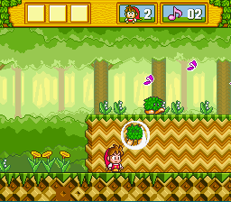 Unlike its prequel, DoReMi Fantasy: Milon's Exciting Adventure is a straightforward platformer. As it has been described in reviews elsewhere, the gameplay is a mixture of Super Mario Brothers and Sonic the Hedgehog. You can jump on enemies Mario-style by pressing B, but this only stuns them momentarily. To properly dispatch them, you must press Y which makes Milon blow a bubble. The enemy is trapped in the bubble, and touching them will send the bubble flying off-screen. If they knock into another baddie, they will go flying away too. Pressing and holding Y will charge a super attack, in which upon release Milon will launch several bubbles in different directions. The comparison to Sonic the Hedgehog does not come from the game's speed, but rather from the springboards that will send Milon busting through blocks and walls. In the sweets world, champagne corks launch Milon into the air at 45 degrees to bust through blocks.