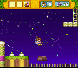 Score is not kept, and there is no time limit, so feel free to explore the game and find the bonus mini-games. Health is measured by the color of Milon's clothing. Green clothes represent full health, blue is middle, and red indicates that you're one step away from death. You collect music notes throughout the game, just like the coins in Super Mario Brothers, and every 100th note will give you a 1UP.