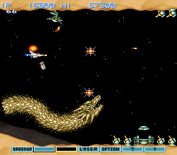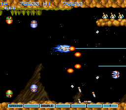 Who doesn't know Gradius? I almost feel embarassed to explain the gameplay. A side-scrolling shooter, powerups are collected after shooting yellow enemies or a chain of enemies. The powerups are on a point system, so you can save up these powerups to obtain speed ups, missles, more powerful firepower, options, and shields. Before you begin your game, you can choose your powerup configuration from some preset choices or customize your own. For example, you can choose between the laser, ripple, or double laser.