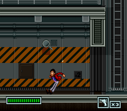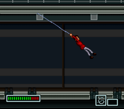 This is an action platformer, although while Lupin is armed with his fists, kicks, and his pistol, the focus is not so much on the violence but on the problem solving. The game reminds me a bit of the game Impossible Mission for the Commodore 64. (There was a port of Impossible Mission for the Atari 7800 which was totally impossible: they forgot to program the part of the game in which you access computer terminals). You must leap over trap floors, avoid electric walls, defeat robots, and solve puzzles. Each level of the game poses a more difficult set of problem solving than the last. (Hint: sometimes the best way to subdue a computer is to just blast it with your gun!) And being a true thief, Lupin can crawl through ventilation shafts to break into new rooms. Lupin starts out with all the tools he will need, such as bullets for the gun, dynamite, a medicine bottle for replenishing health, a pair of springy boots that allows you to jump super high, and a flash bomb that stuns the robots momentarily. But the coolest item is the wire that Lupin uses to swing. Your wire can latch onto the ceiling to allow you to swing and haul yourself up to ledges above. Not only does this mean swinging Indiana Jones-style, but more like Spider-Man in that you can continue to swing from one object to the next if you time it right. It's fun! Along the way you will acquire powerups to replenish your supplies.