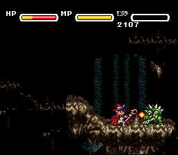 Gau is a little dragon-like monster who can breathe fire and hit enemies with his tail. Holding down the attack button will keep him blowing fire, but just as with Tatt, a meter limits the fire's usage. At a full meter, he has full range of his fire breath. The more you hold it down, the range decreases. He can jump the highest and quickly.
