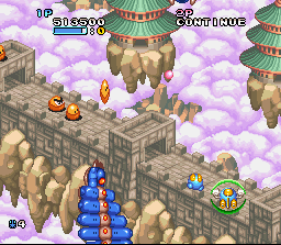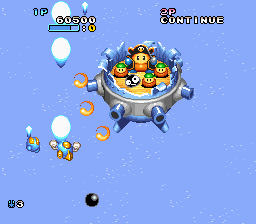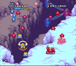 I was first introduced to Twinbee through the Parodius series. The Twinbee series has a home on the Super Famicom in the form of Pop 'N Twinbee. Like Parodius, Pop 'N Twinbee is a colorful cute-em-up by Konami. This game was not released in North America, but it was released in PAL format for the European market. Perhaps that was Konami's way of making up for the fact that they did not release Gradius III in the UK.