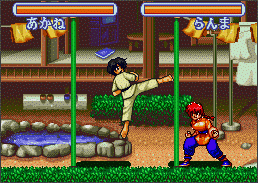 This was the very first game I bought for my SNES. In fact, I bought it before I bought my SNES. I used to stay up all night playing this game until my fingers hurt. The "VS." screens and the animated sequences have some pretty nice graphics, but the regular game screens lack a bit. The game brings out a lot of aspects of the manga/anime series. I like how you fight in familiar places like the Jusenkyo springs and the Tendo's back yard. Ryoga's umbrella and headbands are a nice addition. And I like Ukkyo in this game. She's very cute in this one.