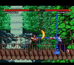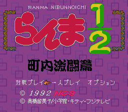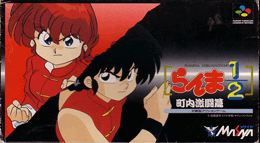 The first Ranma game for the Super Famicom features some of the series most popular (and wacky) characters! Ranma Saotome hears about a martial arts tournament, with an invitation to see China (If you read the manga or seen the anime, you know where this is going) as the prize. Other Ranma characters are there either for the prize, or just to cause Ranma trouble. The 1 player story mode lets you pick Ranma only. However,you get to pick before each opponent if you wish to be Ranma boy or girl.Your first opponent is Genma (Genma Saotome), then Kodachi (Kodachi Kuno). After that, you enter a bonus round with Happy (Happosai), and have to hit him 10 times before time runs out to earn an extra credit (continue). Next,you fight Kunoh (Tatewaki Kuno), then Kohchoh (Principal Kuno). Next is a bonus round with Colon (Cologne), where you must hit the bowls of ramen and sweet chestnuts she throws (any combination of 10) before time runs out to earn one more credit. Then,you take on Shampoo (Shampoo) and then the final opponent, Ryohga (Ryoga Hibiki). Ranma finds out what the "invitation to see China" really is (I won't spoil it for you if you don't know...but it is in both the anime and manga...the "Ranma and Juliet" storyline), and a funny end credits chase ensues! The 2 player mode lets you duke it out as Ranma boy, Ranma girl, Genma, Kodachi, Kuno, Kocho, Shampoo and Ryoga. However....(See Extras for more!) The controls can be set to your preferance in the options menu,but you cannot set the "Jump" move to the directional pad.