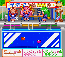 2. Doki Doki slot - Using the A button, players stop the rolling sections to match up the head, body, and legs of the characters on the slot machine. Matching the top 2 panels will score points, but it's best to get all 3.