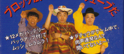 What's also weird is that there's apparently a Japanese comedy team called "Ostrich Club." I'm pretty sure that the tagline "Kiitenai yo!" has to be their trademark phrase. The trick to Japanese comedy is to latch onto some insipid catchphrase and repeat it ad nauseam and the viewers just think it's funny. Japanese viewers, that is. For the rest of us, we fail to find this sort of derivative "comedy" funny. The same goes for hitting each other on the head with squeaky rubber mallets. On the back of the box, you can see a picture of these three guys making the intergalactic sign of the ostrich. They appear in the game, too. Oh yay.